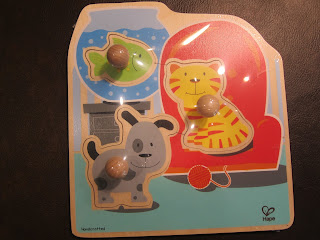 I love this puzzle. It is nice in size, but not too big. There are nice large wooden knobs, great for little hands. Little Sparks suggested having your child name each animal and the sound of they make. You can also show your child what happens when the shape doesn't fit in the puzzle. This puzzle comes at a great time, as my son is struggling with his pincer grasp. This puzzle will be a great development tool for him.