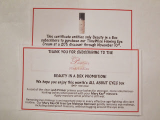 MK Beauty Box included information about the products in the box along with a coupon for 20% off TimeWise Firming Eye Cream