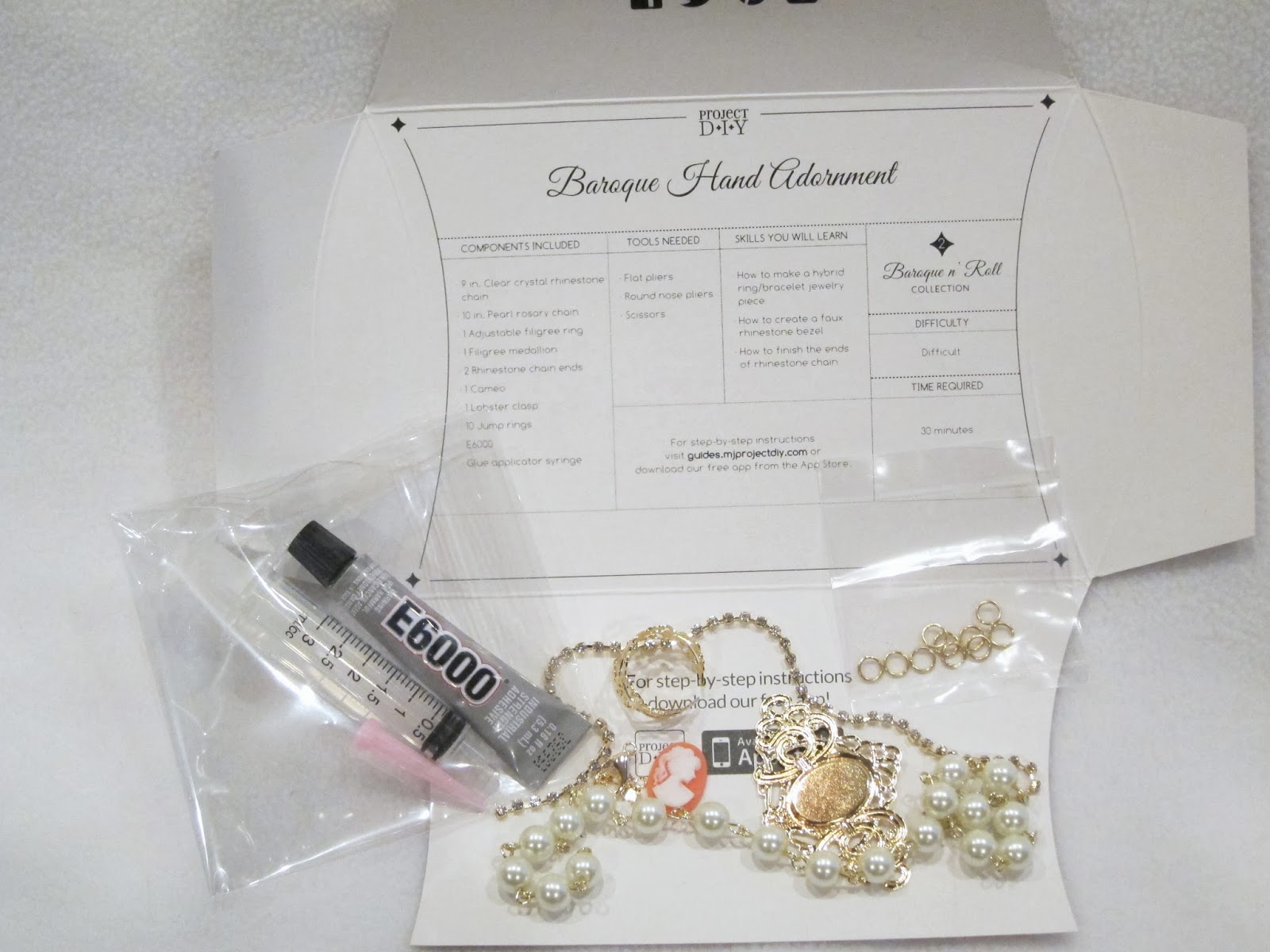 I was really excited to see another Project DIY on my doorstep. Project DIY sent me this box to review. For $30.00, Project DIY sends materials to make two to three fashion accessories. This month, Project DIY featured the Baroque n' Roll collection. This collection is inspired from 17th century Europe characterized by drama, tension and grandeur. This collection features metallic lace, ornate metal castings, pearls, rhinestones, and detailed embellishments.