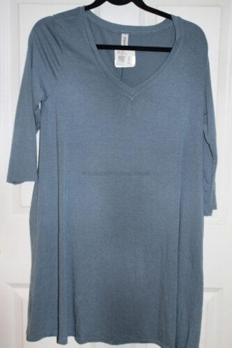 This grey/blue stripe top has a v-neck and is light weight. It's 95% Rayon and 5% Spandex. The shirt is long enought to be worn with leggings or you could do a side knot if you want it shorter.