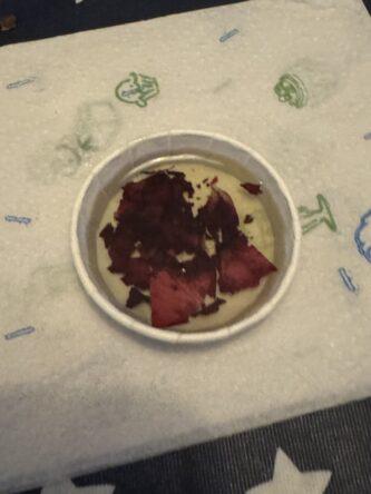 The first step is to melt the oils. Then you add the rose petals, and essential oils. You pour the mixture in a cardboard cup and place it in your frigerator.